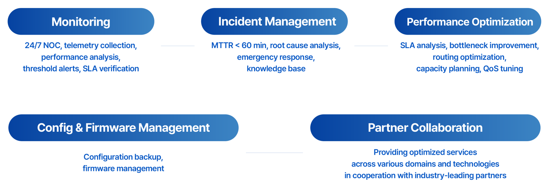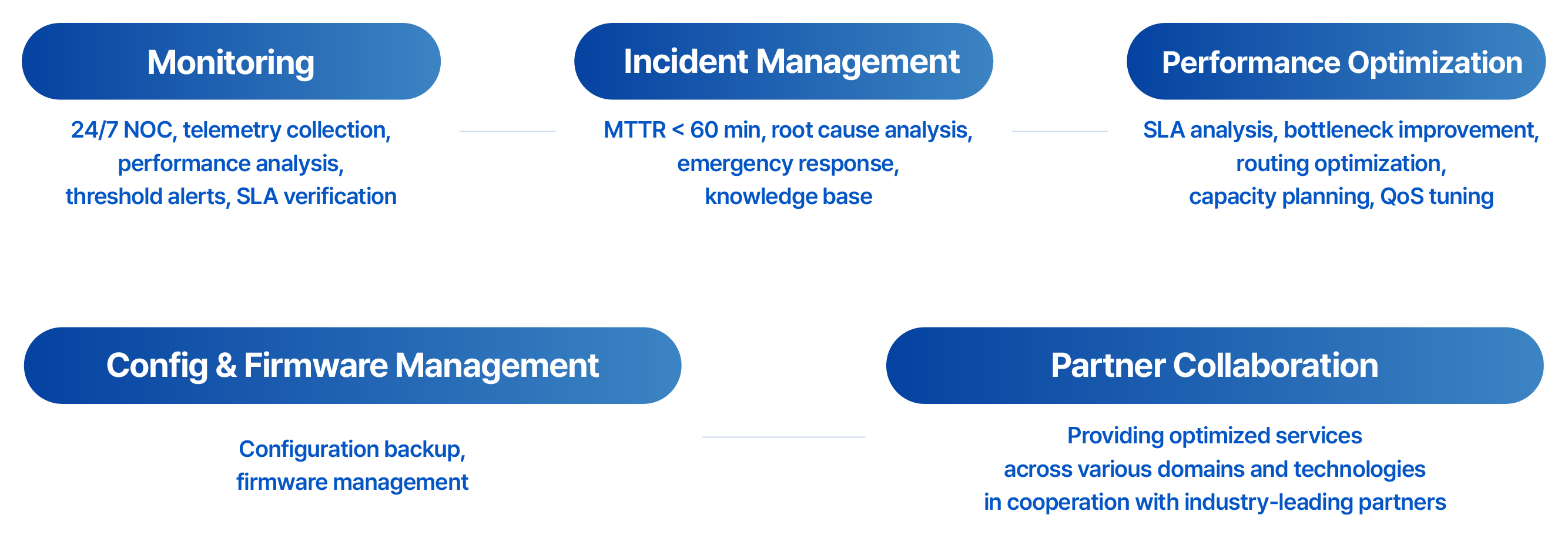 ∙ Preventive maintenance, ITIL-based change management, and monthly/quarterly business reviews.